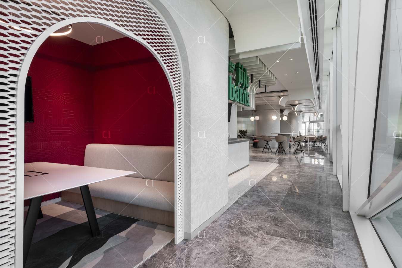 The Ground Floor Main Lobby project involved fitout, furniture, and IT execution of a high-traffic, multifunctional space that includes the main reception, a state-of-the-art experience center, a café zone, and a series of support spaces such as meeting rooms, waiting areas, and client engagement zones. The design was developed by a third-party consultant, and C1 was entrusted with bringing that vision to life through high-quality execution.